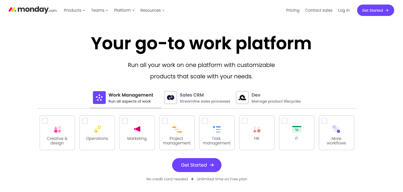 - Multiple solutions: Monday.com offers three separate solutions for three different purposes – (i) Task & project management, (ii) Sales CRM, and (iii) Software development.
