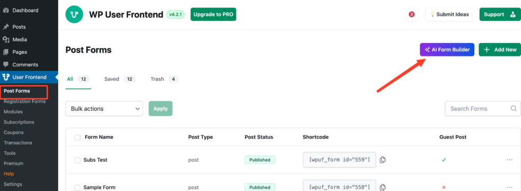 Simply navigate to WP Admin dashboard >> Post form >> click on “AI Form Builder”