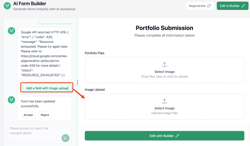 Note: After moving from the AI Form Builder to the Edit with Builder page, you can no longer edit that post form using AI prompts.